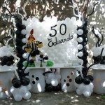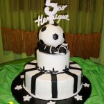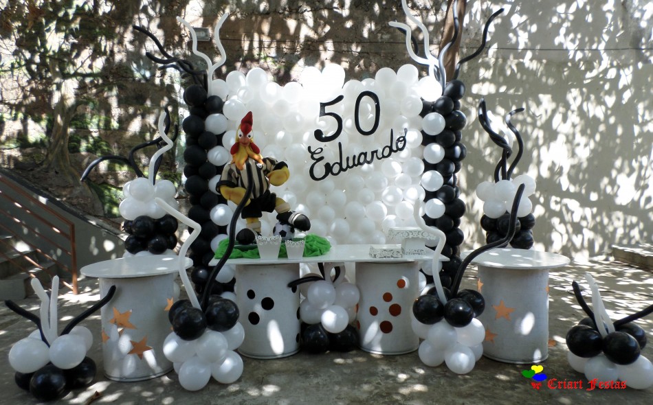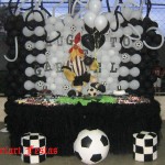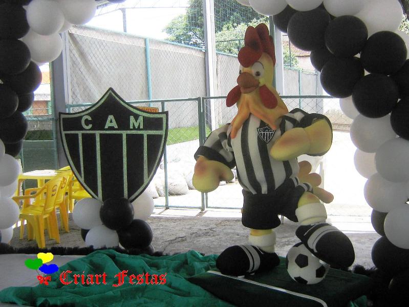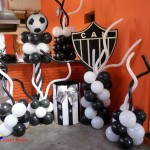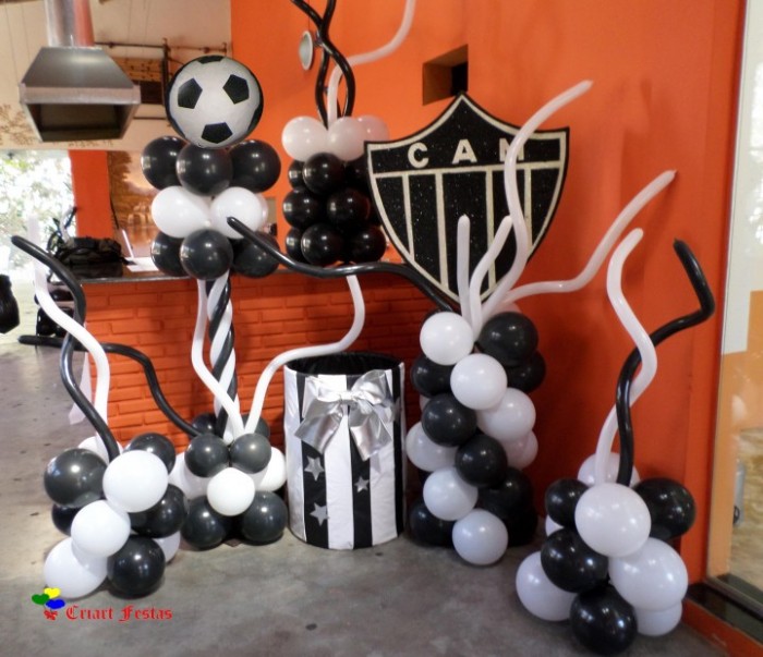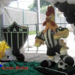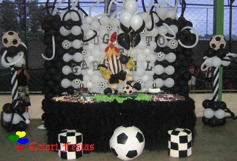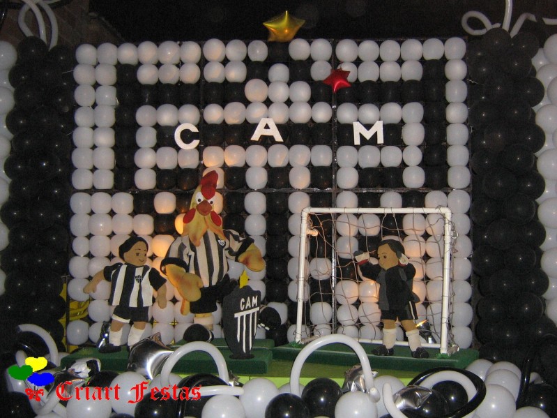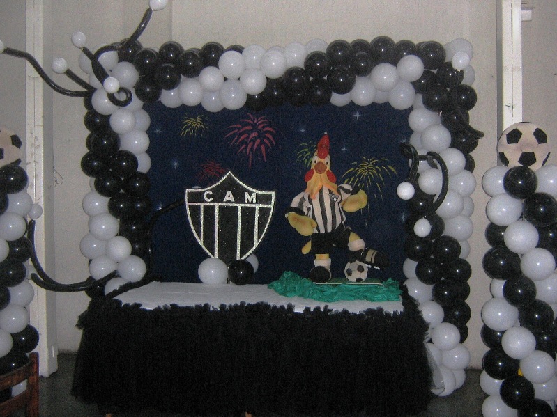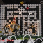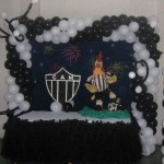 Montagem: 2 Postes com bola, arco, escudo, painel de madeira e toalha de tule. Opção Bolo falso.